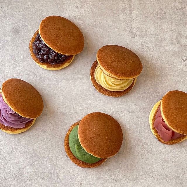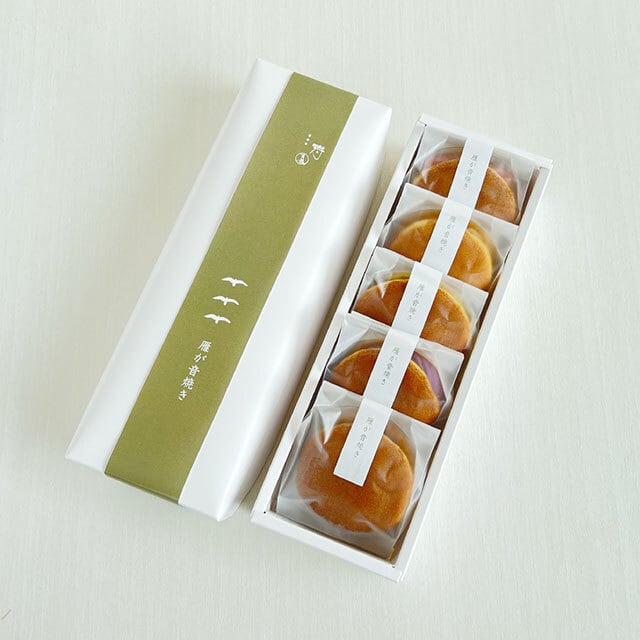 厳選素材を使った餡は、小豆・抹茶・桜・安納芋・紫芋の5種類。卵をたっぷり使ったふんわり香ばしい生地と重なり、素材の豊かな味わいと、美しい彩りを楽しめます。各1個ずつ入っています。